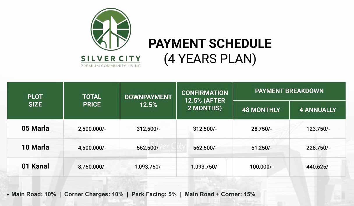 The price of the property is the most important thing to consider before investing in a property, but Silver City Rawalpindi/Islamabad brings an affordable and flexible payment plan. The society offers 4 Marla, 5 Marla, 6 Marla, 7 Marla, 10 Marla, and 1 Kanal residential plot on a 4-year installment plan.